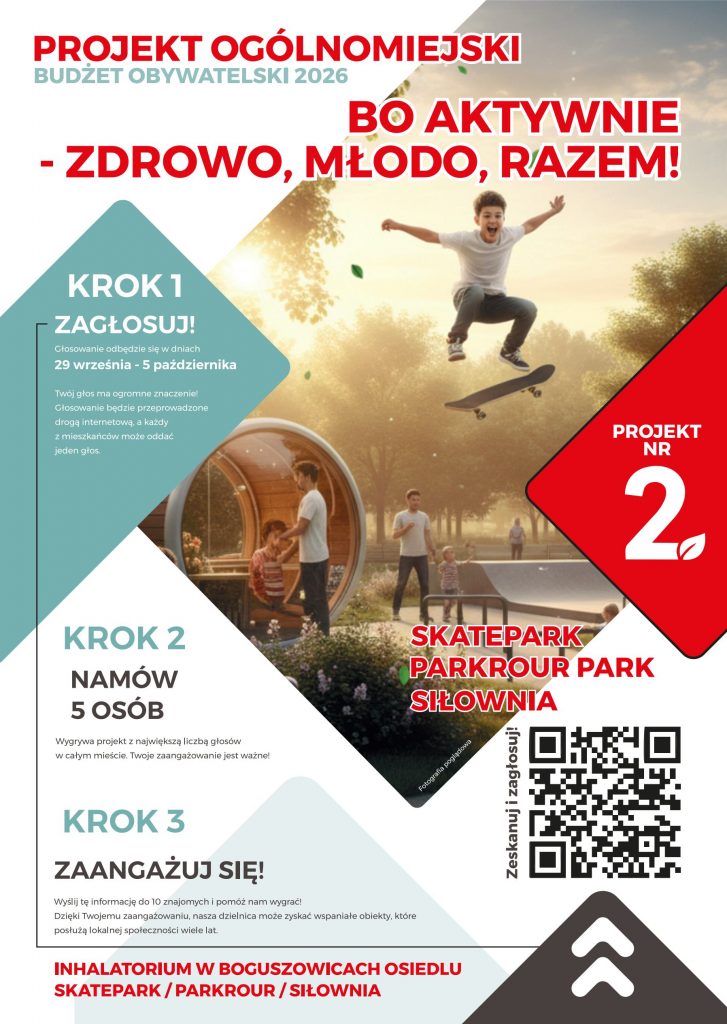 - poprawę infrastruktury sportowo-rekreacyjnej – skateparku i budowę urządzeń do streetworkout’u w osiedlowym parku!
